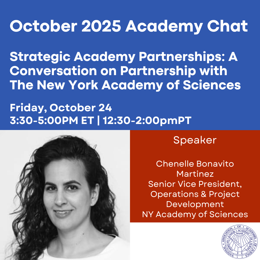 October 2025 Academy Chat - Strategic Academy Partnerships: A Conversation on Partnership with The New York Academy of SciencesFriday, October 24, 2025 - 3:30-5:00pmET | 12:30-2:00pmPT